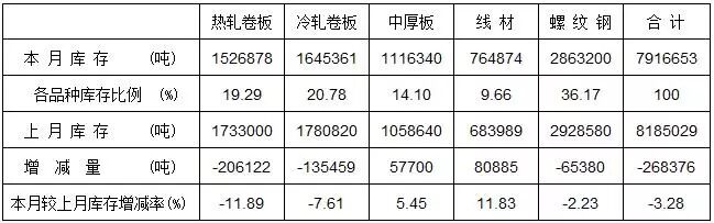 本月5大品種鋼材庫(kù)存環(huán)比各有升降,其中線材上升幅度最大。熱軋卷板庫(kù)存環(huán)比下降11.89%,冷軋卷板庫(kù)存環(huán)比下降7.61%,中厚板庫(kù)存環(huán)比上升5.45%,線材庫(kù)存環(huán)比上升11.83%,螺紋鋼庫(kù)存環(huán)比下降2.23%,詳見(jiàn)下表。